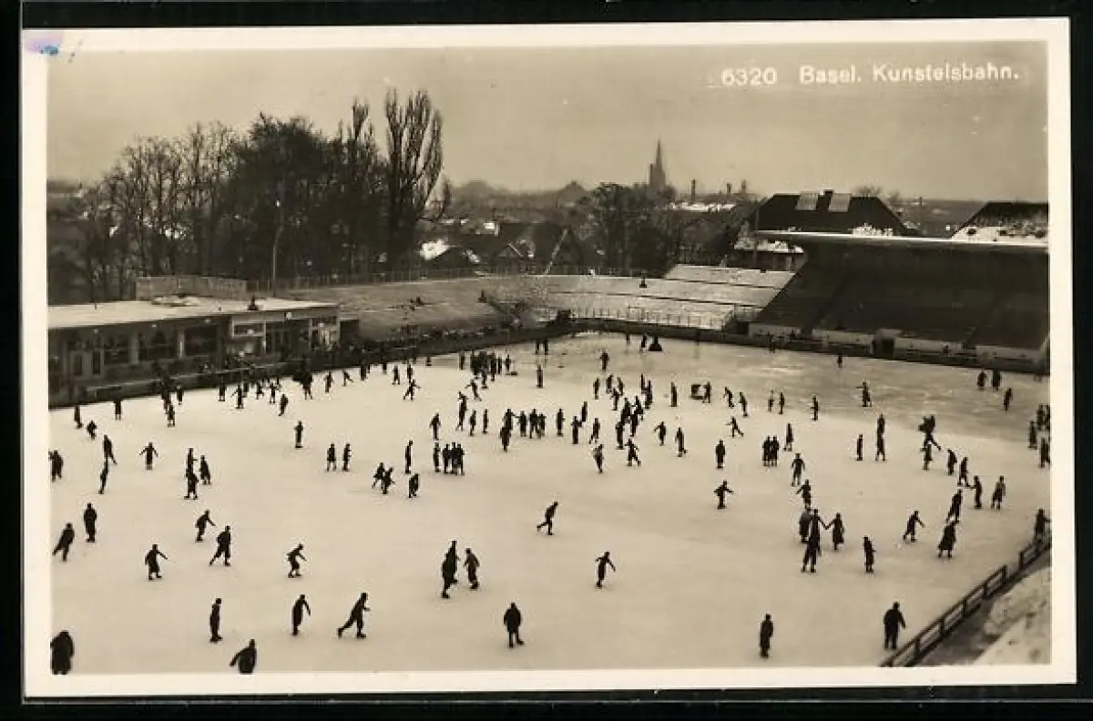 AK Basel, Kunsteisbahn mit Schlittschuläufern aus der Vogelschau
