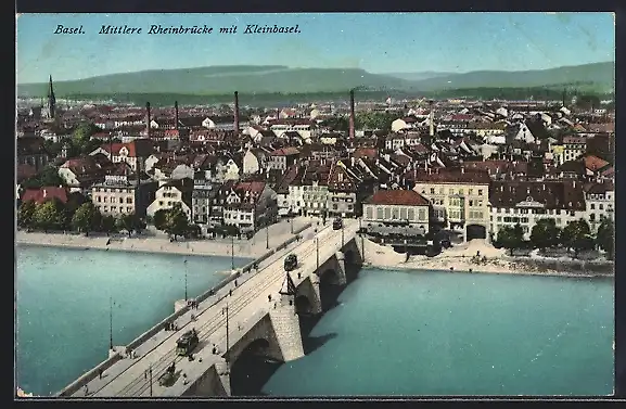 AK Basel, Mittlere Rheinbrücke mit Kleinbasel
