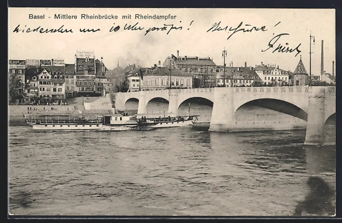 AK Basel, Mittlere Rheinbrücke mit Rheindampfer