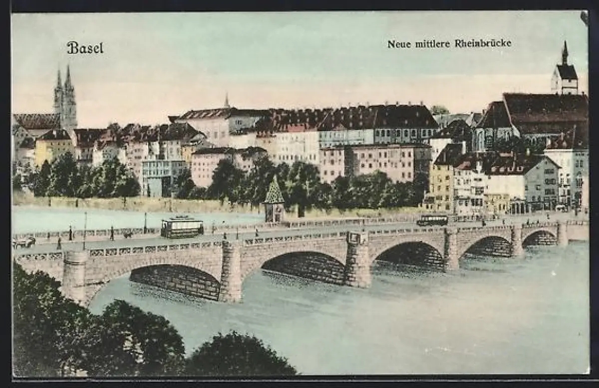 AK Basel, Mittlere Rheinbrücke mit Strassenbahn, Autobus, Ortsansicht, Vers