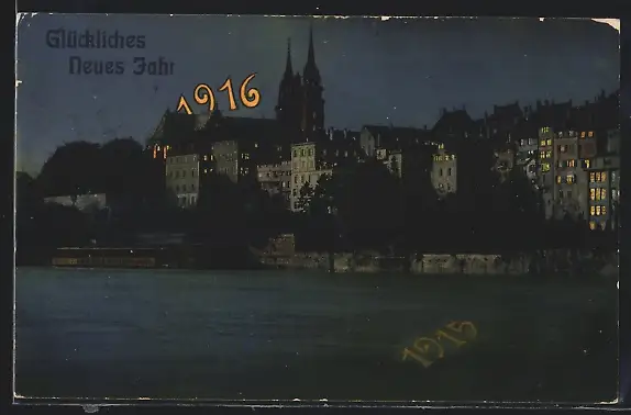 AK Basel, Nächtliches Panorama, Neujahrsgruss 1916