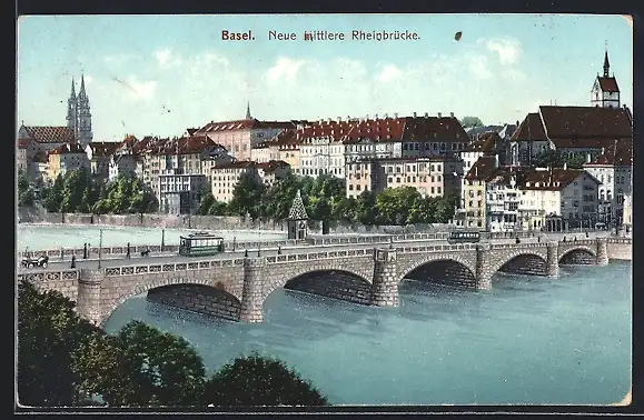 AK Basel, Neue mittlere Rheinbrücke, Strassenbahn