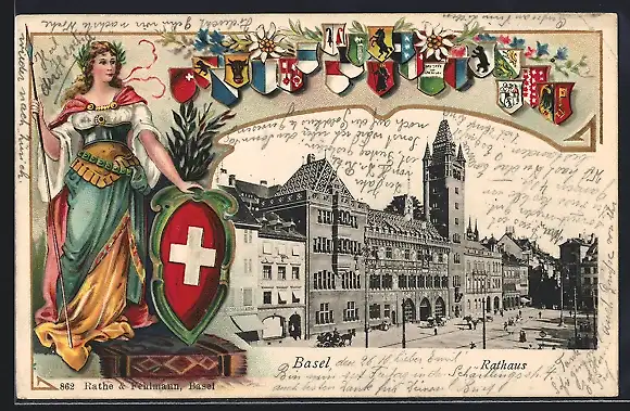 AK Basel, Partie am Rathaus, Passapartout mit Helvetia im Wappenschild, Kantons-Wappen