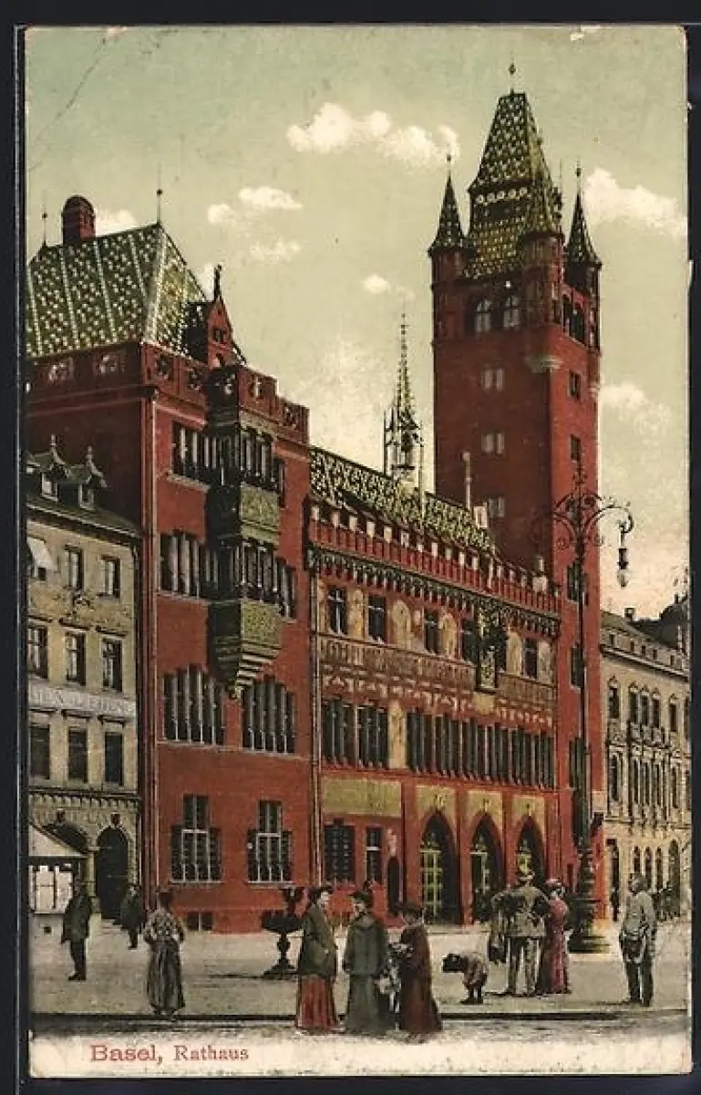 AK Basel, Rathaus mit Strassenpartie