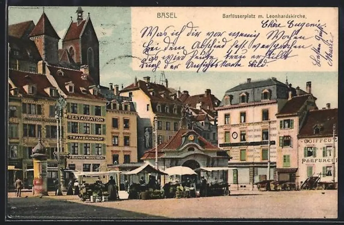 AK Basel, Restaurant Trambahnhof am Barfüsserplatz mit Leonhardskirche