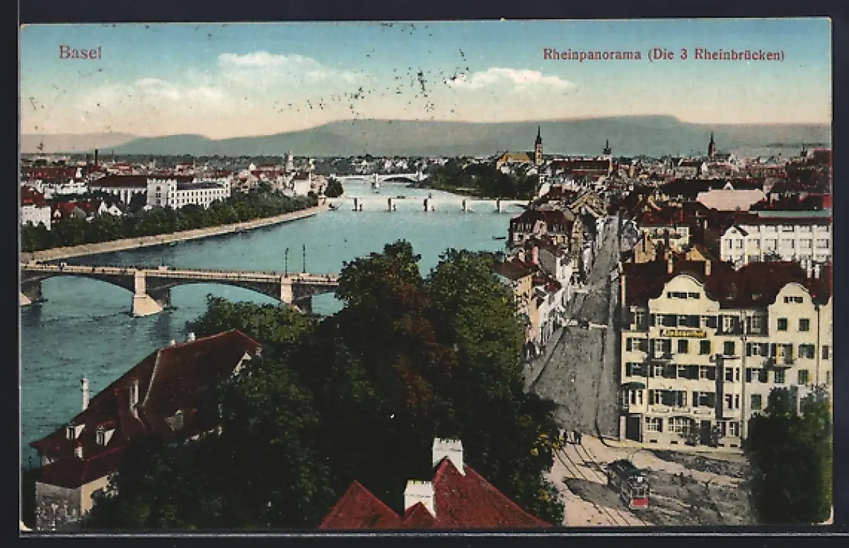 AK Basel, Rheinpanorama mit den drei Rheinbrücken