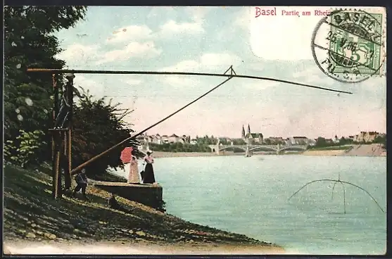 AK Basel, Rheinpartie mit zwei Frauen und Jungen