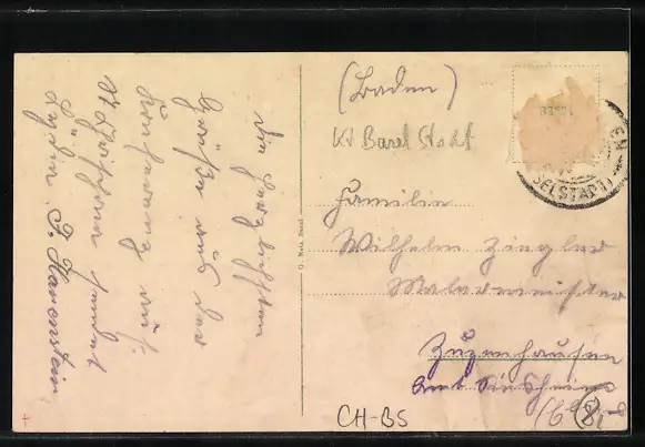 alte Ansichtskarte, gelaufen, Briefmarke entfernt, rückseitig Oberflächenschaden, guter Zustand