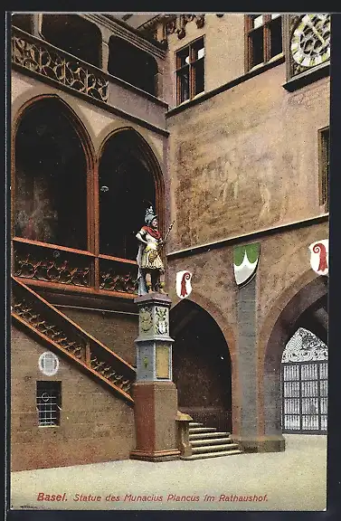 AK Basel, Statue des Munacius Plancus im Rathaushof
