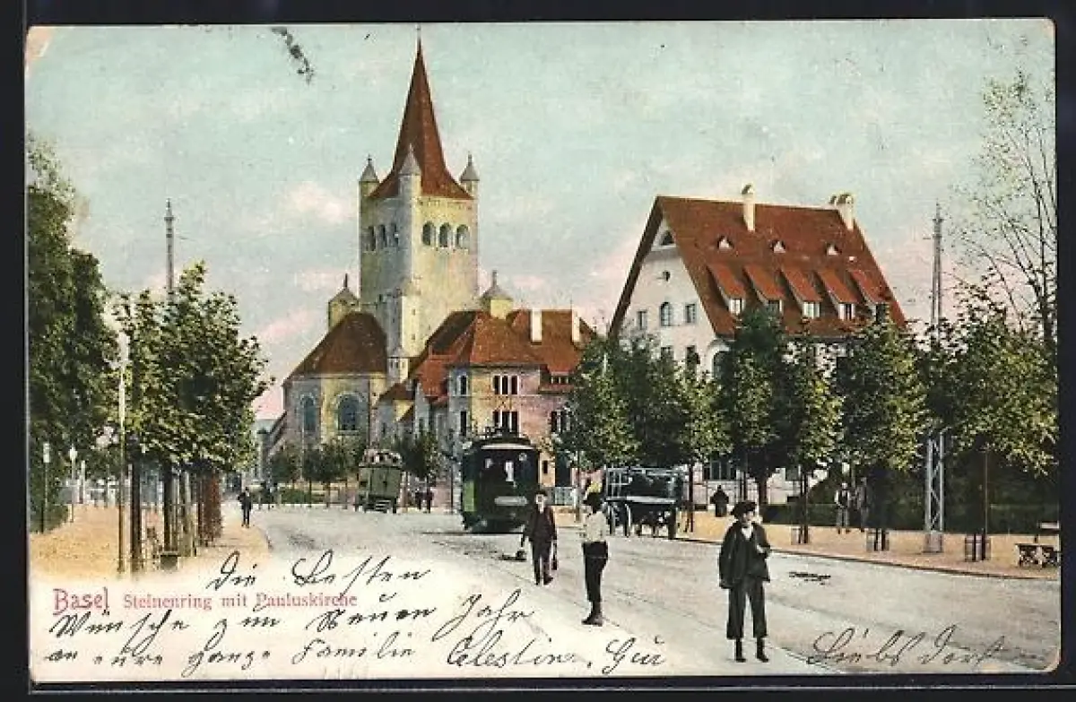 AK Basel, Steinenring mit Pauluskirche, Strassenbahn