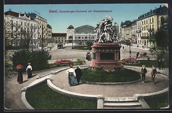 AK Basel, Strassburger-Denkmal mit Bundes-Bahnhof