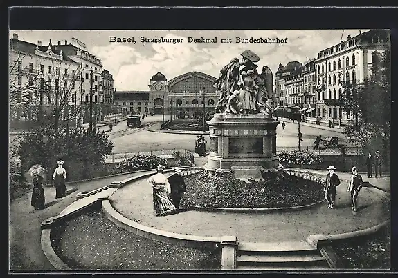 AK Basel, Strassburger Denkmal mit Bundesbahnhof, Leute