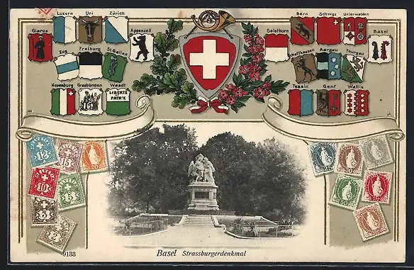 AK Basel, Strassburgerdenkmal mit Briefmarken