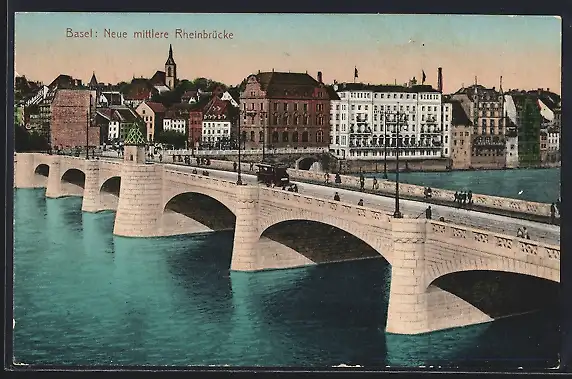 AK Basel, Strassenbahn auf der neuen mittleren Rheinbrücke