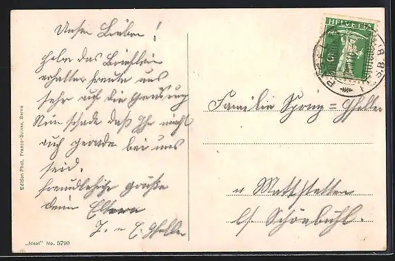 Personenbezogene Daten auf der Rückseite der Karte wurden durch blauen Textmarker unkenntlich gemacht. Die blauen Stellen sind auf die Vorderseite durchgeweicht und wirken sich negativ auf das Postkartenfoto aus