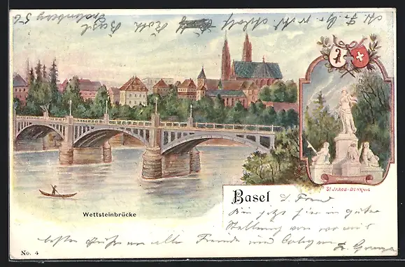 AK Basel, Teilansicht mit Brücke, St. Jakob-Denkmal, Wappen