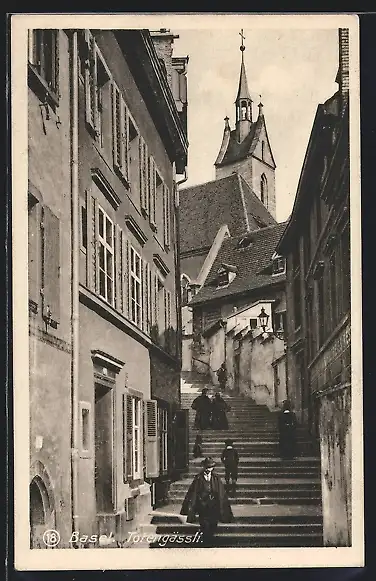 AK Basel, Totengasse mit Blick zum Turm der Peterskirche