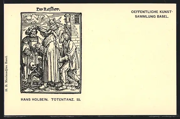 AK Basel, Totentanz, Der Tod schleicht um einen Ratsherrn herum