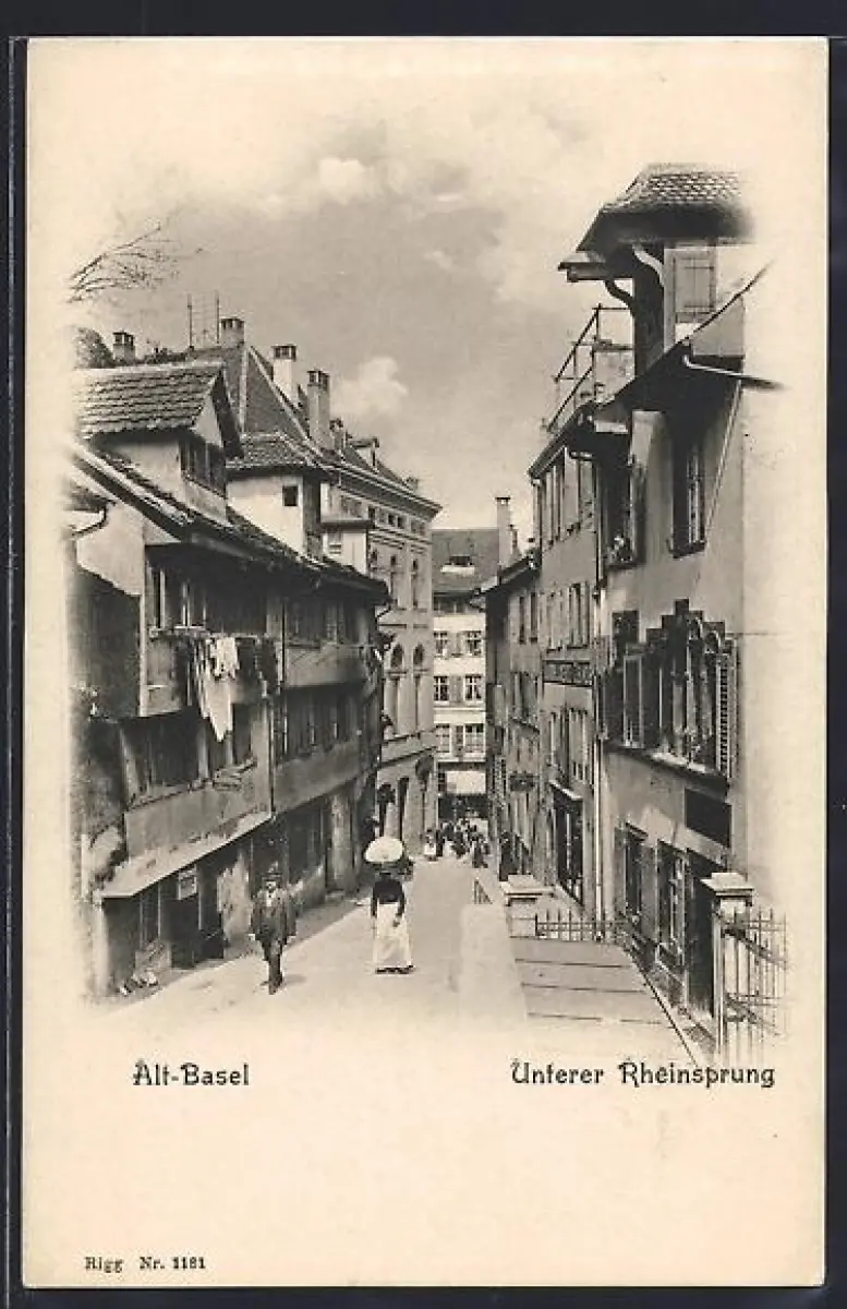 AK Basel, Unterer Rheinsprung, Strassenpartie mit Geschäften