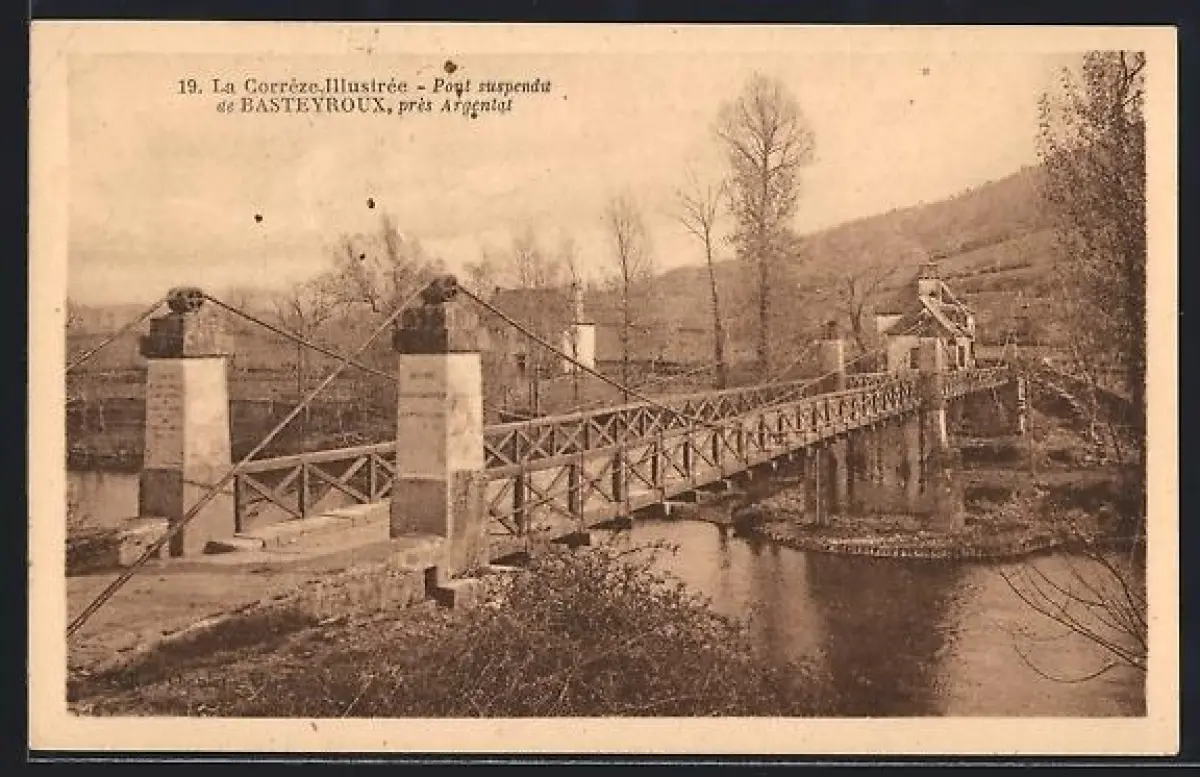 AK Basteyroux /Argentat, Pont suspendu sur la rivière dans un paysage de campagne
