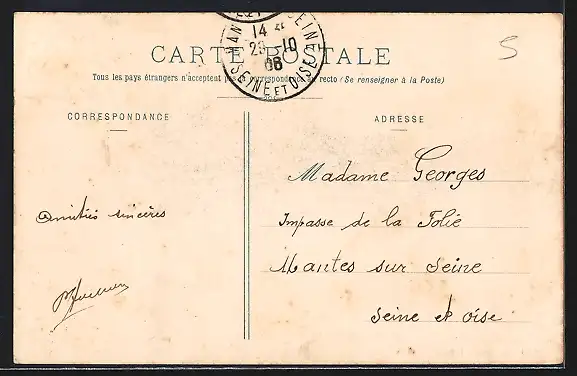 Personenbezogene Daten auf der Rückseite der Karte wurden durch blauen Textmarker unkenntlich gemacht. Die blauen Stellen sind auf die Vorderseite durchgeweicht und wirken sich negativ auf das Postkartenfoto aus