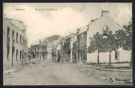 AK Battice, Rue de la Station, Trümmer zerstörter Häuser