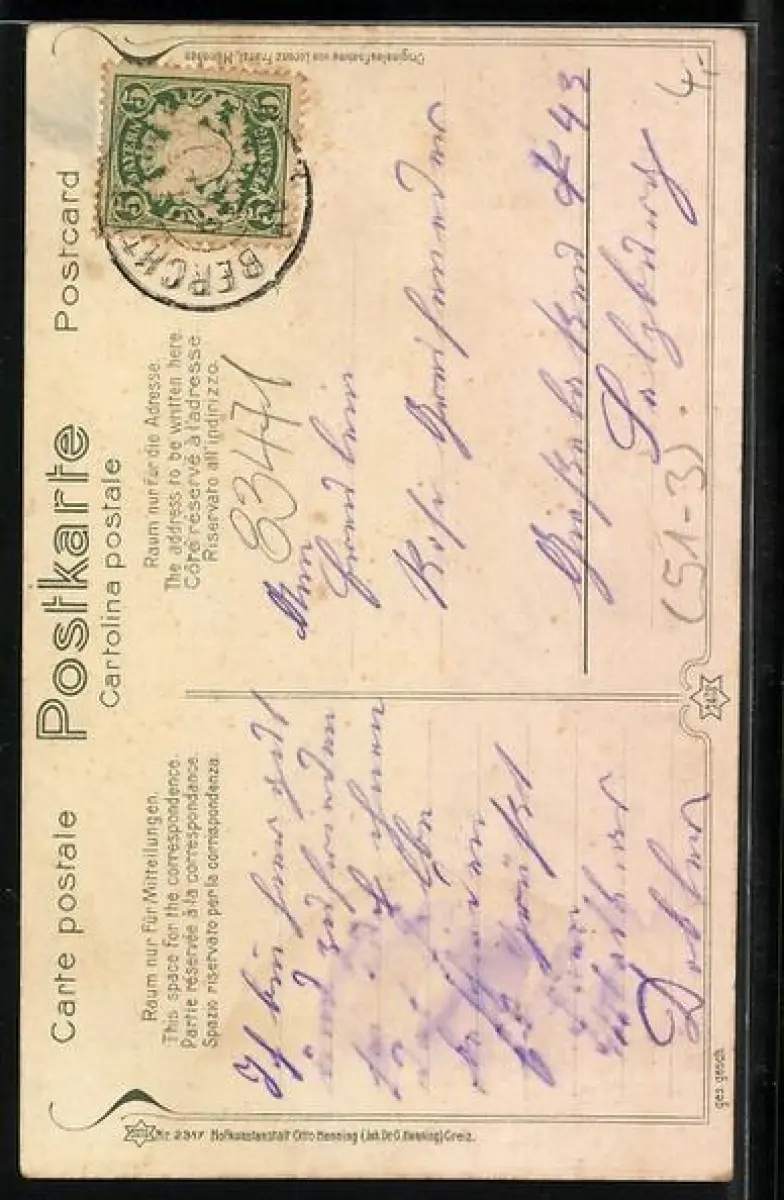 Personenbezogene Daten auf der Rückseite der Karte wurden durch blauen Textmarker unkenntlich gemacht. Die blauen Stellen sind auf die Vorderseite durchgeweicht und wirken sich negativ auf das Postkartenfoto aus