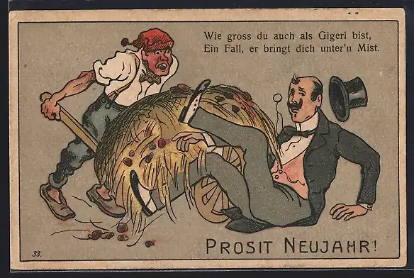 AK Bauer überfährt eleganten Herrn mit Mistkarren, Scherz, Neujahrsgruss