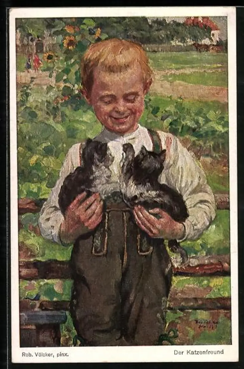 AK Bauernjunge hat kleine Katzen auf dem Arm