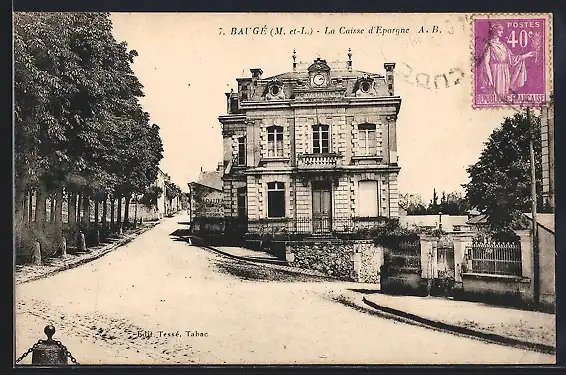 AK Baugé, La Caisse d`Épargne et rue arborée adjacente
