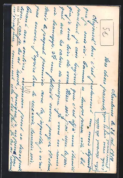 Personenbezogene Daten auf der Rückseite der Karte wurden durch blauen Textmarker unkenntlich gemacht. Die blauen Stellen sind auf die Vorderseite durchgeweicht und wirken sich negativ auf das Postkartenfoto aus