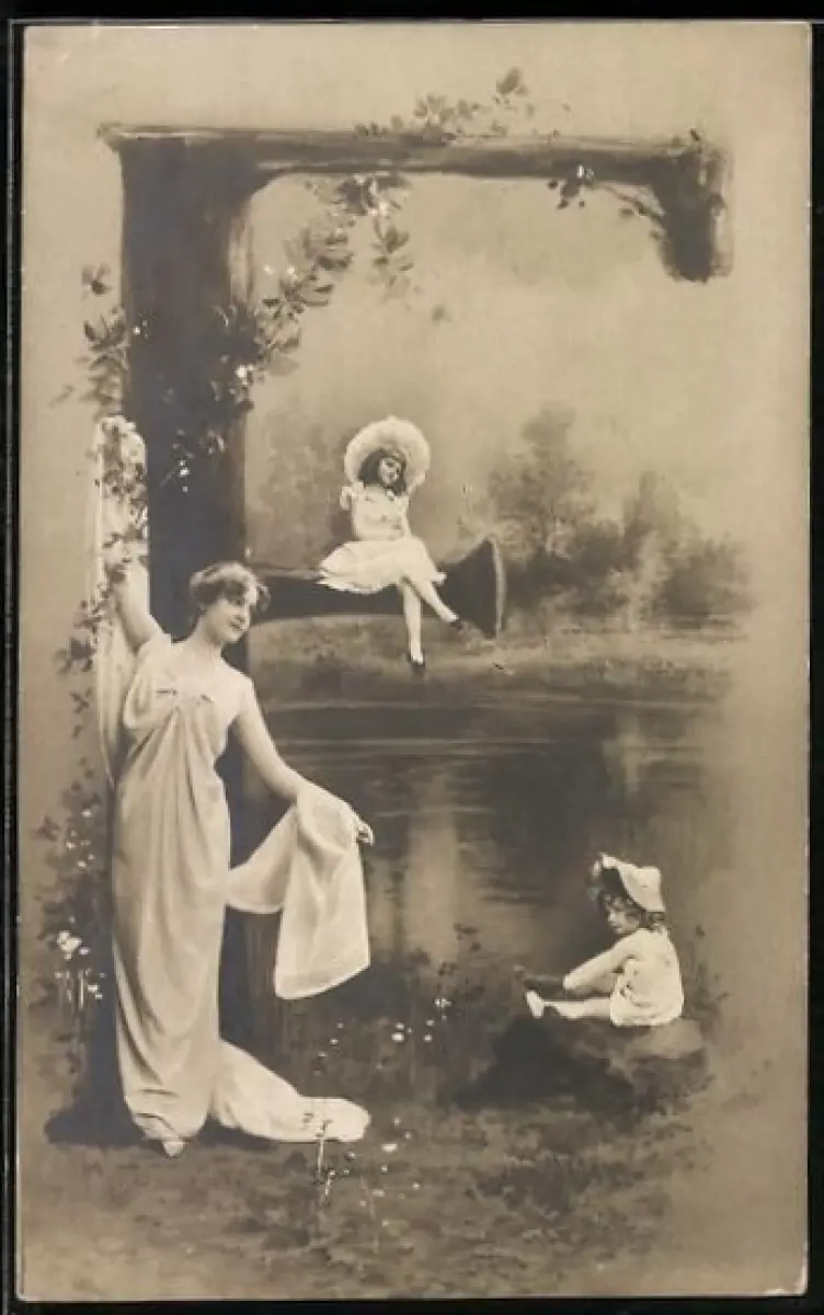 AK Baum In Form des Buchstaben P, Frau und Kinder am und auf dem Baum