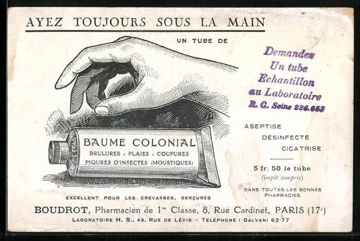 AK Baume Colonial, Boudrot Pharmacien, Reklame, Hand greift nach der Handcreme