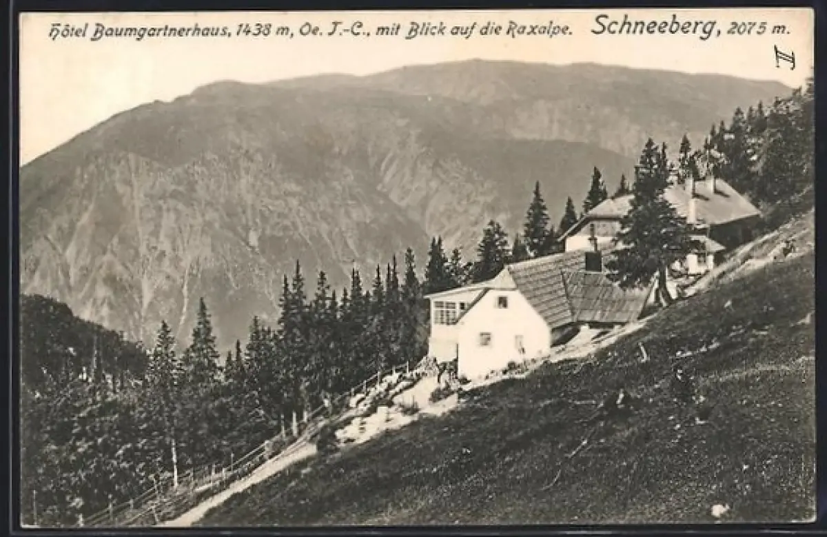 AK Baumgartnerhaus, Berghütte auf dem Schneeberg mit Blick auf die Raxalpe