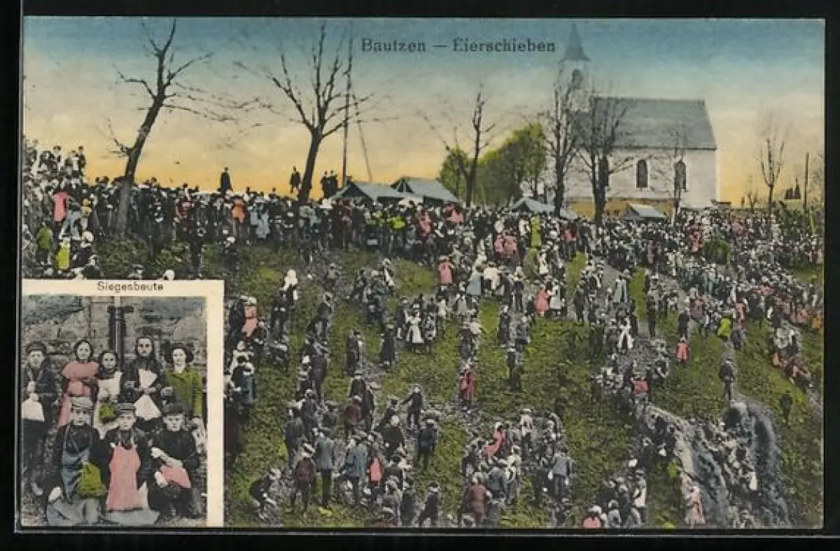 AK Bautzen, Bautzner Eierschieben, Kinder mit Säcken voll ihrer Siegesbeute