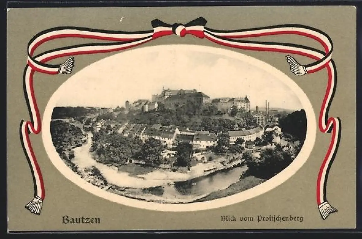 AK Bautzen, Ortsansicht vom Prositschenberg aus, im Rahmen, Schleifenbanderole in Nationalfarben