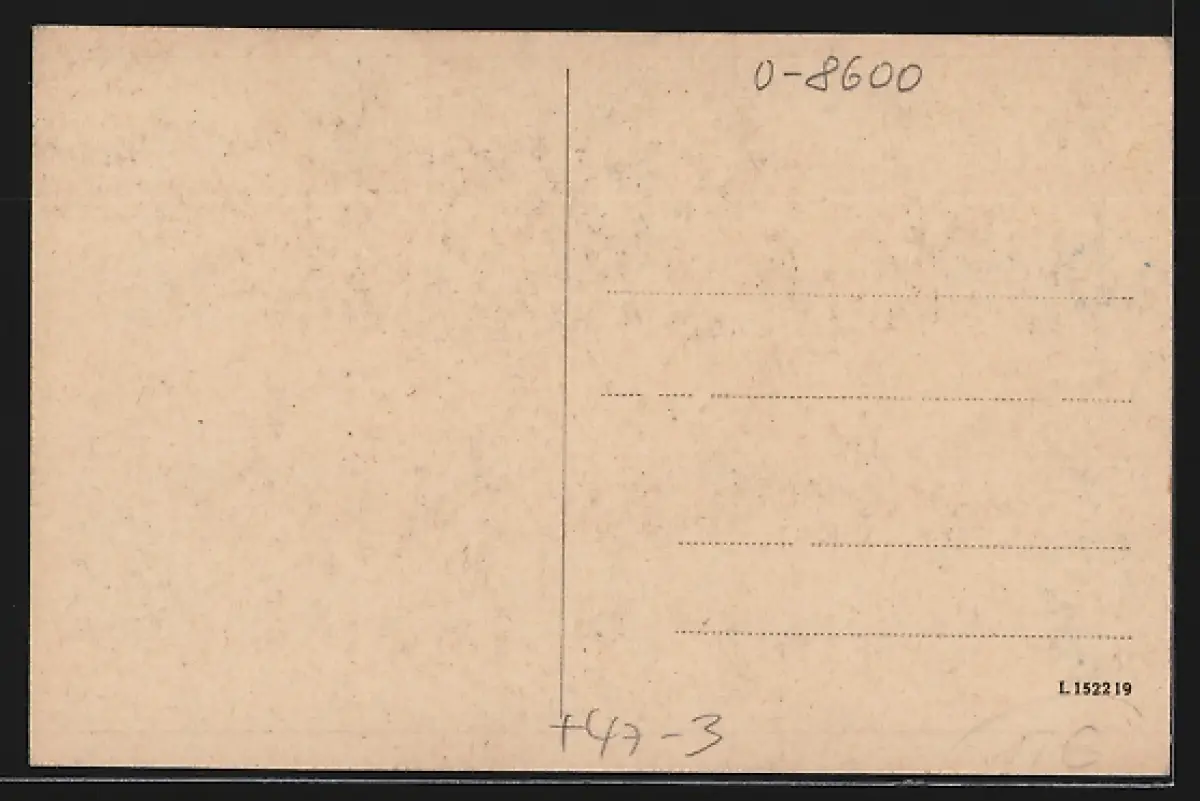 Personenbezogene Daten auf der Rückseite der Karte wurden durch blauen Textmarker unkenntlich gemacht. Die blauen Stellen sind auf die Vorderseite durchgeweicht und wirken sich negativ auf das Postkartenfoto aus