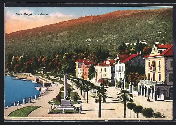 AK Baveno /Lago Maggiore, Ortspartie mit Denkmal und Bergen