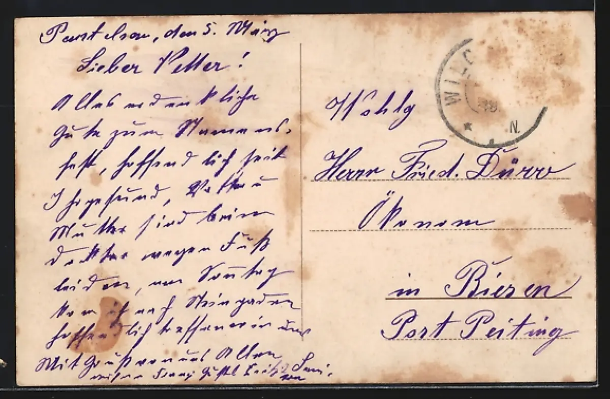 alte Ansichtskarte, gelaufen, Briefmarke entfernt, rückseitig Oberflächenschaden, guter Zustand