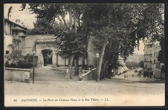AK Bayonne, La Porte du Château-Vieux et la Rue Thiers
