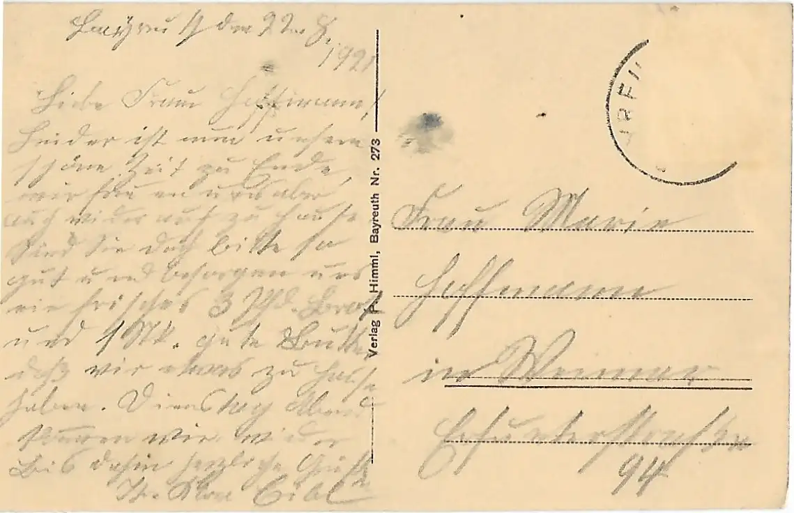 Bayreuth: Verlag P. Himml, ca. 1925. Karte, 9 x 14 cm