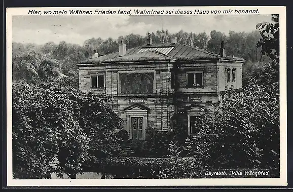 AK Bayreuth, Villa Wahnfried, Frontansicht, Gedicht Hier, wo mein Wähnen Frieden fand