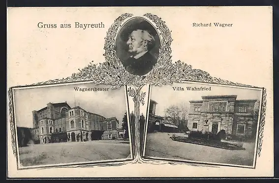 AK Bayreuth, Wagner-Theater und Villa Wahnfried, Portrait Richard Wagner