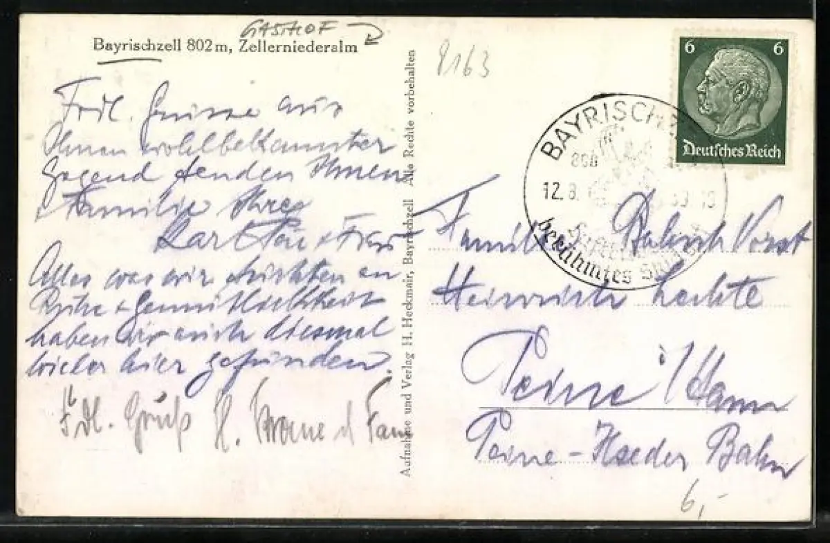Personenbezogene Daten auf der Rückseite der Karte wurden durch blauen Textmarker unkenntlich gemacht. Die blauen Stellen sind auf die Vorderseite durchgeweicht und wirken sich negativ auf das Postkartenfoto aus