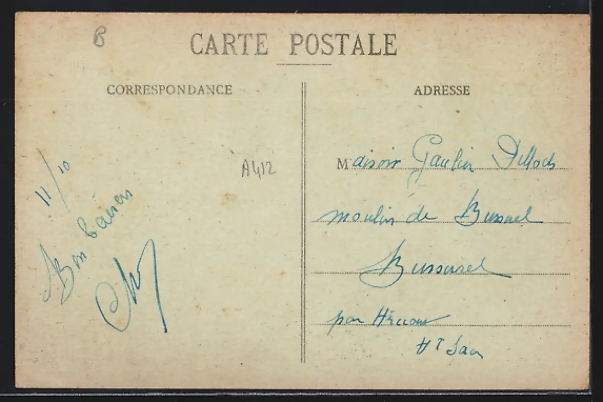 Personenbezogene Daten auf der Rückseite der Karte wurden durch blauen Textmarker unkenntlich gemacht. Die blauen Stellen sind auf die Vorderseite durchgeweicht und wirken sich negativ auf das Postkartenfoto aus