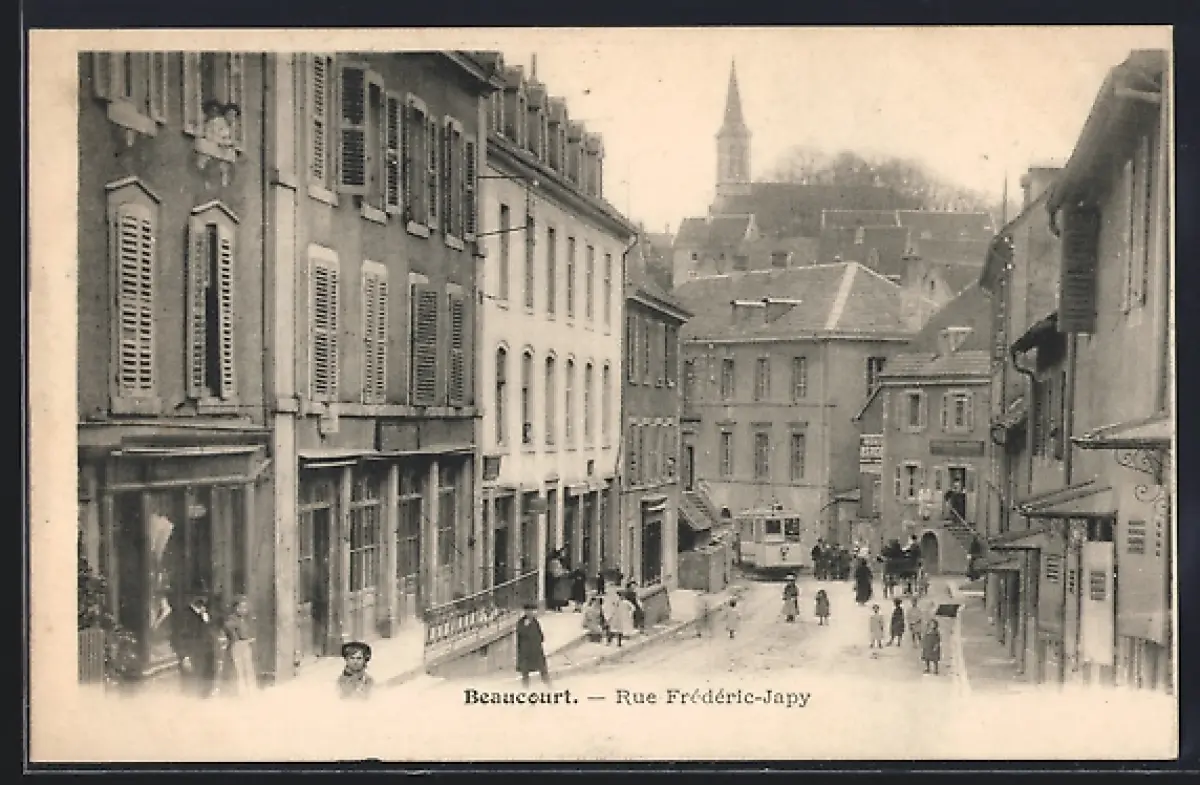 AK Beaucourt, Rue Frédéric-Japy animée avec passants et vue sur le clocher en arrière-plan