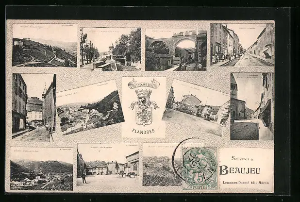 AK Beaujeu, Vue générale (coté est), Le Pont Paradis, Grande Rue, Quartier Saint-Nicolas, Place Clémentine