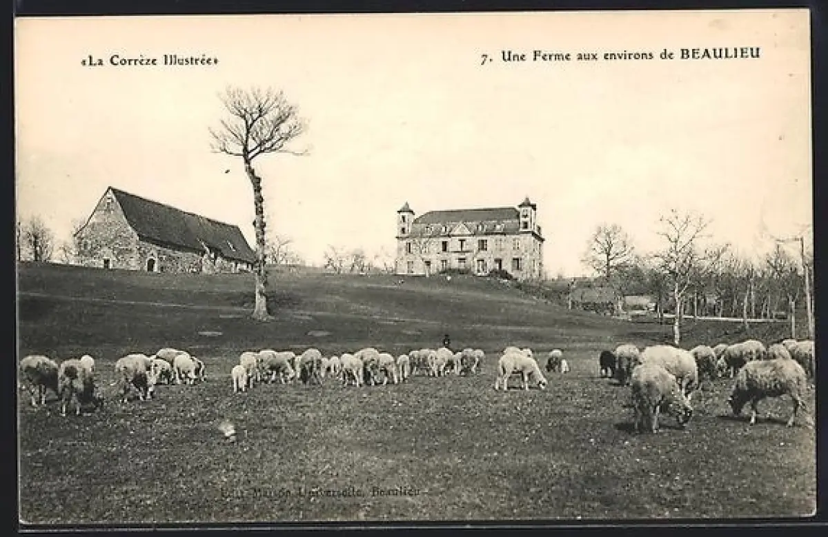 AK Beaulieu /Corrèze, Une ferme avec des moutons paissant dans le pré