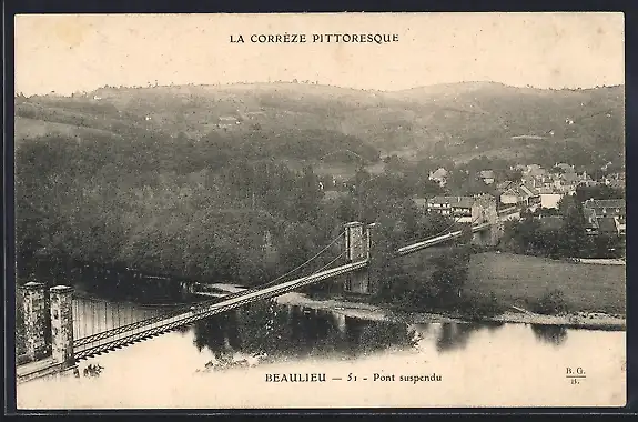 AK Beaulieu, Pont suspendu sur la rivière dans un paysage pittoresque