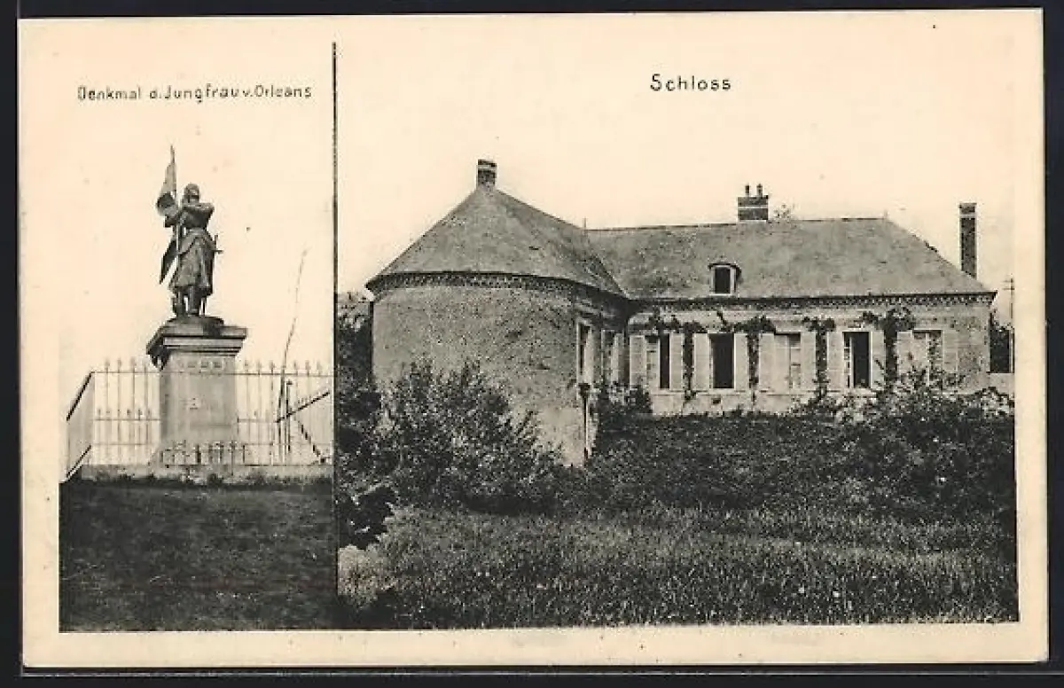 AK Beaulieu-les-Fontanes, Monument de Jeanne d`Arc et vue du château